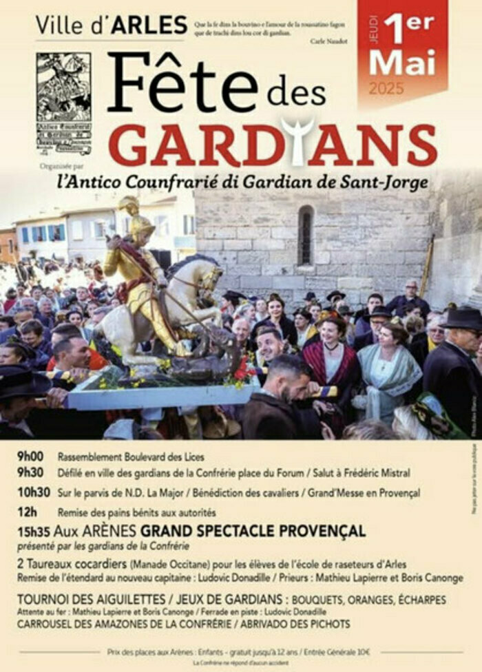 Défilé des gardians dans la ville se rendant à l’église de la Major assister à la messe. L’après-midi, gardians, arlésiennes et mireilles se retrouvent aux arènes d’Arles pour les jeux gardians où chacun tentera de prouver son courage et son habilité lors de différentes épreuves à cheval.